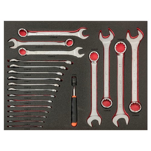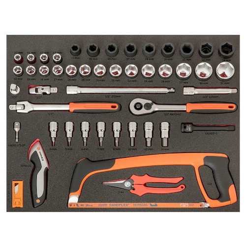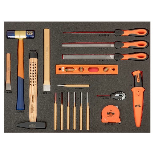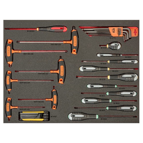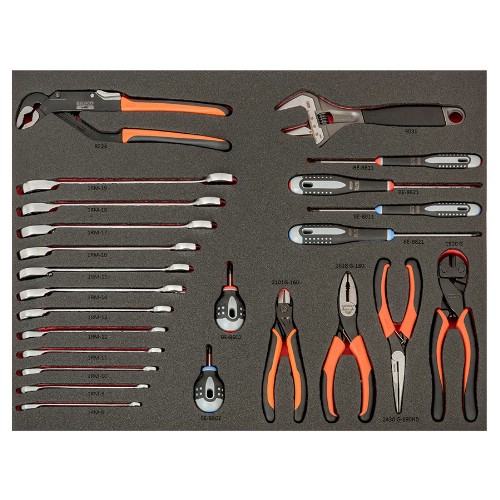 Verktygsvagn med 7 lådor, varav 6 med totalt 341 verktyg. Med tålig rostskyddande pulverlack. Utbytbar bänkskiva med stålkant. Rundade hörn med stötdämpare av kompositmaterial skyddar både vagn och omgivning. Förstärkta dubbla väggar gör att lådorna kan öppnas även om vagnen fått bucklor. Lådorna har glidskenor med kullager och kan öppnas helt. Mjuka gummihjul varav två fasta och två vridbara, tål flertalet vanliga lösningsmedel. Bekvämt handtag som kan fästas på vagnens båda sidor. Det runda låssystemet skyddar mot stöld. Greppvänlig nyckelhållare och två nycklar medföljer. Hål på sidan för fäste av tillbehör. Bahcos inlägg med verktyg och BETMS-lösningar passar i lådorna. Förberedd för Bahco Xpand tillbehör.