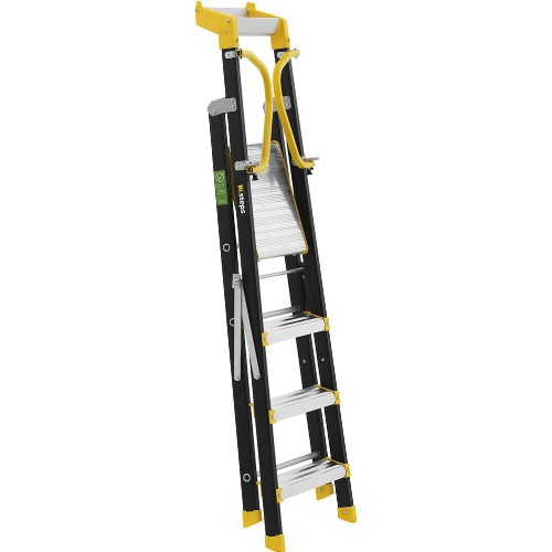En robust, stabil och hållbar trappstege för daglig professionell användning. Extra stor metallplattform (400 x 400 mm) med grovt dubbelriktat halkskydd. Fällbara räcken ger en säker arbetsplats med rejält fallskydd på 3 sidor. Stor metallhylla med gott om plats för verktyg m m. Ergonomiska stegfronter och greppvänliga profiler. Sammankopplade aluminiumlänkar så att man kan låsa båda sidor med ett handgrepp. Innovativ infästningsteknik med FDS-skruv ger en stabil konstruktion med minimal svikt. Byggd med ett certifierat aluminium som tillverkas med förnybara energikällor och ger ett lägre koldioxidavtryck. För att underlätta transport så finns hjul monterade på stödsidan på 6- och 8-stegsmodellen.