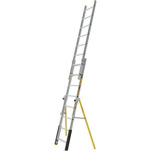 Extra bred 2-delad anliggande utskjutsstege som ger användaren bättre räckvidd och gott om plats för att klättra bekvämt och säkert. För daglig användning då det ställs höga krav på hållbarhet, slitstyrka och säkerhet. Tillverkad av stark BOX-profil i aluminium med kraftiga infästningar som gör stegen stabil och hållbar. Stegpinnar med dubbelriktat halkskydd. Med nivåutjämningsben som gör det enkelt att räta upp stegen på lutande och ojämna underlag, justerbara upp till 200 mm. Toppfästenas design gör att det även är lätt att använda stegen fristående. Automatisk låsning försäkrar att stegen alltid är säkert låst under användning.