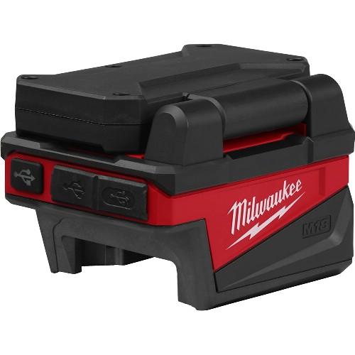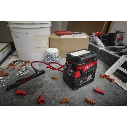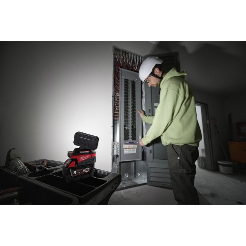 Effektiv LED-belysning med ljusflöde på 1000 lumen. Horisontell och vertikal justering av belysningshuvudet. Integrerad upphängningskrok. Upp till 110 timmars driftstid när den används med ett M18 5,0 Ah Li-Ion batteri. Skyddsklass IP54. Inbyggd laddare för laddning av mobil enhet via USB-A (15 W) och USB-C (27 W). Flexibelt batterisystem, passar samtliga Milwaukee M18-batterier.
