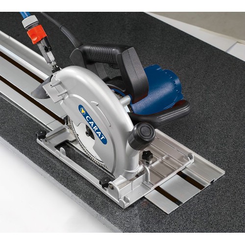 Håndholdt flissag på skinne, for perfekt kapping av stein- og betongplater. Med PRCD-bryter, mykstart og overbelastningsbeskyttelse. Med integrert vannkjøling, støvavsug, styreskinne med klemmer og justerbar høyde på saghodet.