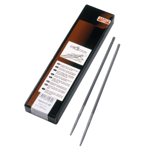 Rund sågkedjefil för skärpning av skoveltandade sågkedjor. Varje fil är förpackad i skin-pack som kan återanvändas som filskydd.