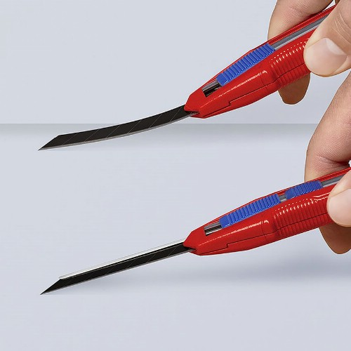 Universell brytbladskniv passande för standardtyper av 18 mm blad, jämna, böjda eller med krokar. Med individuellt justerbar bladstabilisering, bladet kan inte av oavsiktligt böjas eller brytas. Robust, slitstarkt magnesiumhölje med glidfritt grepp. Bladet hålls säkert på plats med hjälp av ett härdat stålstift. Platta, ergonomiska separata skjutreglage för blad och stabiliseringsform. När den bakre änden av handtaget är stängt, kan inte bladet och dess skjutreglage glida ut. Fäste för verktygssäkring Knipex Tethered Tools System. Två reservblad i handtaget.
