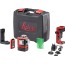 Robost och tålig flerlinjelaser med extra hög synlighet tack vare kraftfulla gröna laserdioder. Projicerar en horisontell och två vertikala 360° klara och tydliga laserlinjer. Räckvidd på upp till 35 m utan mottagare och upp till 70 m med mottagare. Självnivellerande över stort arbetsområde, visuellt larm om lutningen ligger utanför gränsen (± 4°). Laserlinjer med justerbar styrka i tre steg (100%, 75% och 50%). De vertikala laserlinjerna som projiceras mot väggar och tak är lätta att justera efter att lodpunkten ställts in. Den integrerade basen gör att du kan placera de två vertikala laserlinjernas tvärsektion (lodpunkt) där den behövs och sedan justera laserlinjerna med ± 10° samtidigt som lodpunkten är kvar på plats. Damm- och stänkvattenskyddad. 1/4" stativgänga. Drivs av 3,6 V Li-Ion batteri-pack men kan också användas med 3 st 1,5 V AA-batterier eller med nätkabel. Mottagare RGR 200 finns som tillbehör.