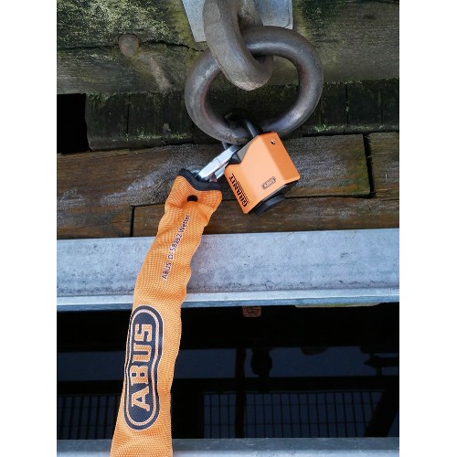 Set bestående av hänglås, låskätting och förvaringspåse. Högkvalitativt hänglås med specialhärdad stålkropp och skivdiskcylinder. Bygel med en diameter på 11 mm som klarar ett dragmotstånd på över 6 ton. Vridbar lucka över cylinderöppningen skyddar mot smuts och dyl. 200 cm lång kätting med 9 mm tjock länk av härdat stål, ögla och ett skyddande nylonöverdrag. Förvaringspåse av slitstarkt material med dragsko på båda sidorna. Kan även fungera som skydd mot väder, smuts eller skav mot ömtåliga ytor när setet används. Godkänt enligt SSF klass 3.