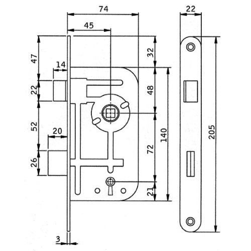 Mått : Låsdjup 74 mm. Nyckelhålsavstånd 45 mm.