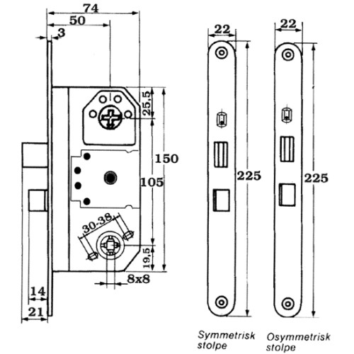 Egenskaper: Uppfyller fordringar enligt Svensk Standard SS 3522, klass 3. Ingår i av försäkringsbolag godkänd låsenhet. Med tryckesfall och regel. Blockeringsmekanism (uppställningsknapp) för vredfunktion i stolpen. Automatisk förregling av regel vid 21 mm utlåsning. Härdad och tvångsstyrd regel. Vändbar tryckesfall för alternativ dörrhängning. Tryckesfall av stål för brandklassade dörrar.