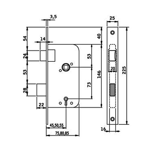 Låsdjup: 75, 80, 85 mm. Nyckelhålsavstånd 45, 50 och 55 mm.