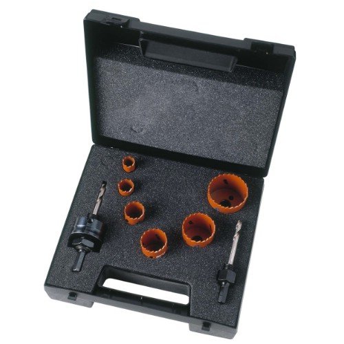 3834-SET-86 Hålsågsats med de åtta vanligaste storlekarna för arbeten inom verkstad och VVS. Innehåller hålsågar: 25, 32, 35, 51, 54, 76, 92 och 114 mm samt hållare ARBR-1130 och ARBR-11152.