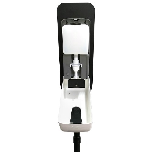 Beröringsfri dispenser med plats för 1000 ml gel/flytande handdesinfektion. Drivs av fyra C-batterier som räcker till ungefär 30.000 användningar. Lampa visar batterinivå. Med enkel låsfunktion. Dispensern kan monteras på vägg eller på det medföljande stativet. Det transparenta fönstret på framsidan gör det lätt att kontrollera hur mycket handdesinfektion som finns kvar i behållaren. Höjden på stativet kan justeras mellan 1250 - 1550 mm. Det beröringsfria dispensersystemet doserar desinfektionen automatiskt när händerna placeras under behållaren.