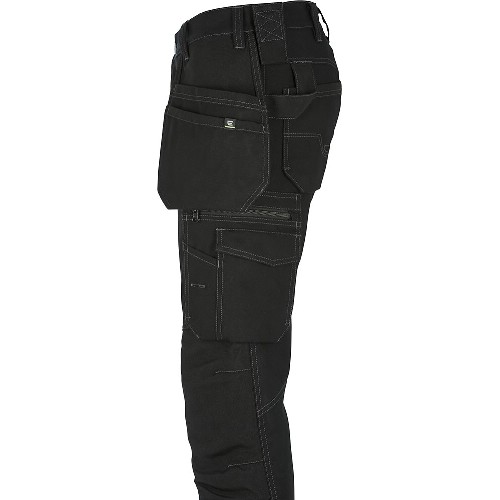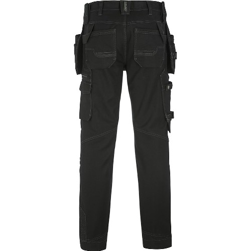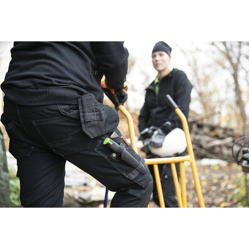 Hantverksbyxa i bomull med verktygsfickor. Tumstocksficka, knivknappar, pennfickor på både höger och vänster sida. Bakfickor med extra rymd. Dubbla hammarhankar och dubbla fästpunkter för hammarhållare. D-ring, vänster benficka med dragkedja samt infälld ID-kortsficka som kan döljas. Samtliga fickor förstärkta med polyamid. Reflexdetaljer. Invändiga knäskyddsfickor med möjlighet att justera placering av knäskydd i rätt höjd. Nedfällbar fåll för längre benlängd. Förböjda ben och förstärkt grensöm. Förstärkt med polyamid på utsatta ställen. Tvätt 75°C.